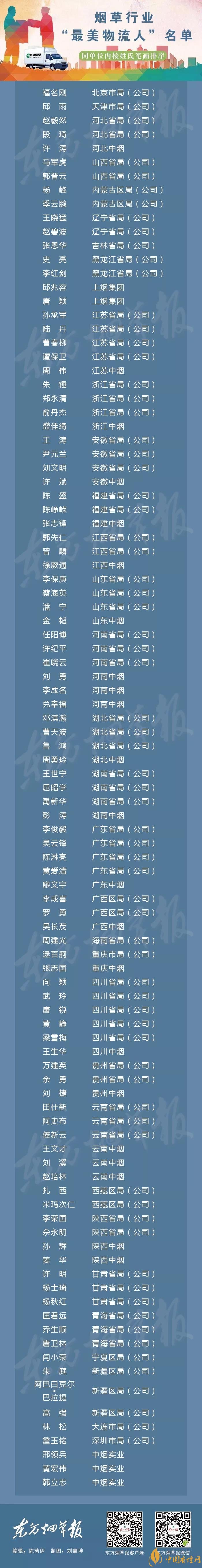 以上就是香煙網(wǎng)小編為大家整理介紹的關(guān)于2018100名基層員工獲評最美物流人名單相關(guān)信息,更多了解點(diǎn)擊:2018細(xì)支煙質(zhì)量抽查南京(雨花石)奪冠:一價類綜合質(zhì)量第一
