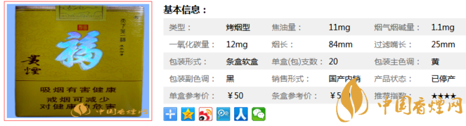 貴煙天下第一福雖然已經(jīng)停產(chǎn),但是知名度還是很大的,下面我們一起來(lái)看看它的參數(shù)信息。煙長(zhǎng)84mm,焦油量11mg,煙堿量1.1mg,一氧化碳量12mg,貴煙特色工藝精工制作,原料保障精挑細(xì)選,產(chǎn)品質(zhì)量嚴(yán)格把關(guān)。