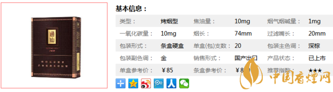 類型 :烤煙型 焦油量 :10mg 煙氣煙堿量 :1mg 一氧化碳量 :10mg