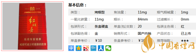 “百順”紅雙喜運(yùn)用了特殊的保潤(rùn)技術(shù),確保煙香和水份不會(huì)隨煙包打開而過快流失,燃燒速度不快,煙支也不易折斷。下面我們一起來看紅雙喜硬百順香煙的參數(shù)信息:焦油量:11mg 煙堿量:1mg 一氧化碳量:11mg