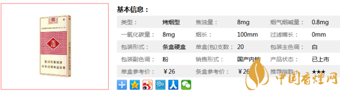 | 類型 :烤煙型 | 焦油量 :8mg | 煙氣煙堿量 :0.8mg | 一氧化碳量 :8mg |