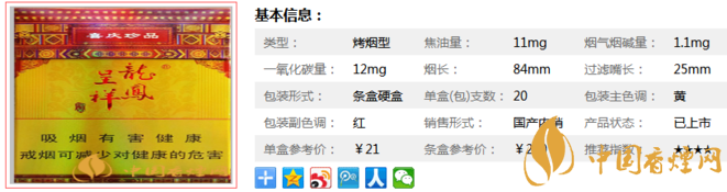 龍鳳呈祥硬珍品煙支長(zhǎng)84mm,提質(zhì)改造后的龍鳳呈祥(喜慶珍品)香煙,全面應(yīng)用具有自主知識(shí)產(chǎn)權(quán)、獲四項(xiàng)國(guó)家發(fā)明專利的復(fù)合生化制劑綜合減害技術(shù),在保持中式卷煙特有香氣與醇厚吃味和諧的同時(shí),能使煙氣中主要有害成分降低30%以上。下面我們一起來看龍鳳呈祥硬珍品的參數(shù)信息:焦油量:11mg. 煙堿量:1.1mg. 一氧化碳量:12mg.