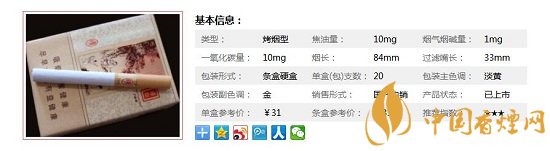 | 類(lèi)型 :烤煙型 | 焦油量 :10mg | 煙氣煙堿量 :1mg | 一氧化碳量 :10mg |