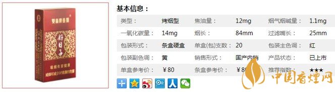 | 類型 :烤煙型 | 焦油量 :12mg | 煙氣煙堿量 :1.1mg | 一氧化碳量 :14mg |