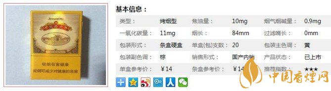 類型 :烤煙型 焦油量 :10mg 煙氣煙堿量 :0.9mg 一氧化碳量 :11mg