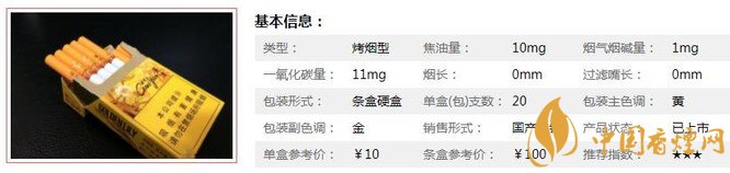 類型 :烤煙型 焦油量 :10mg 煙氣煙堿量 :1mg 一氧化碳量 :11mg