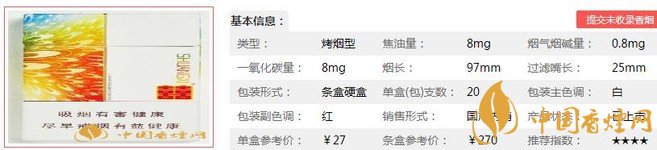 | 類型 :烤煙型 | 焦油量 :8mg | 煙氣煙堿量 :0.8mg | 一氧化碳量 :8mg |