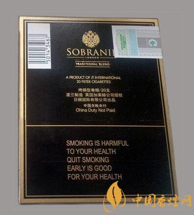 包裝采用了黑色為底色,顏色較偏暗,以金色為輔。金色logo立于正面其上,相當(dāng)醒目。logo之下為SOBRANIIE幾個(gè)字母,最下面為警示語“吸煙有害健康盡早戒煙有益健康”,顯眼奪目,立體感很強(qiáng),磨砂手感,既炫且酷,包裝精美大氣。