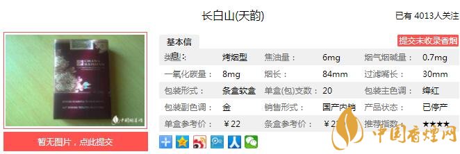 以上便是由香煙網(wǎng)小編為大家介紹的關(guān)于長白山天韻多少錢一包 長白山天韻口感及參數(shù)介紹的相關(guān)信息,想要了解更多有關(guān)內(nèi)容請點擊:白沙硬細(xì)支和氣生財好抽嗎 和氣生財價格及參數(shù)介紹