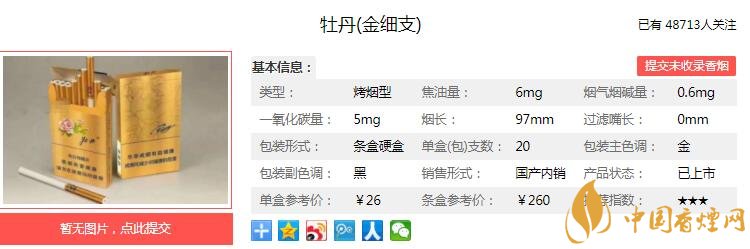 以上便是由香煙網(wǎng)小編為大家介紹的關于牡丹金細支多少錢一包 牡丹金細支口感及參數(shù)介紹的相關信息,想要了解更多有關內容請點擊:日本黑駱駝香煙口感分析及包裝欣賞