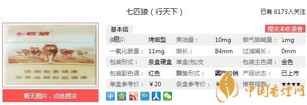 七匹狼行天下煙支長84mm,過濾嘴長34mm,卷紙采用橫紋結(jié)構(gòu),以手捏之,柔軟而充滿彈性。以鼻嗅之,煙草本香氣息不濃,夾雜著果木之香的氣味,充斥著鼻翼。下面我們一起來看七匹狼行天下的參數(shù)信息:焦油量:10mg 煙堿量:1.0mg 一氧化碳量:11mg