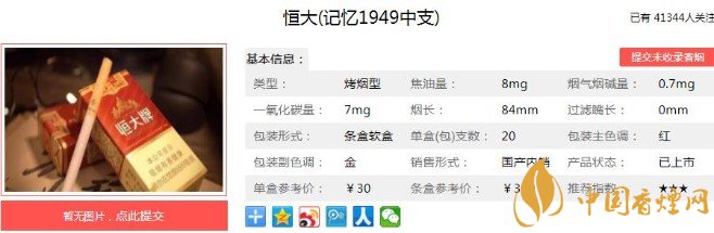 恒大(記憶1949)雖然是老牌包裝,但是不管是顏色還是款式都是比較不錯的。非常純正的煙草原始氣味,加上煙氣的較為順暢度,綜合的滿足感,還算是可以的。煙草的原味釋放得充分,綜合來說是一款比較值得推薦的香煙。下面就跟著香煙網(wǎng)小編一起來看看恒大(記憶1949)具體的詳情吧。
