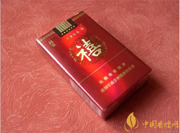 這款八喜香煙的煙盒是大紅色軟包,煙盒正中是一個(gè)喜慶的團(tuán)花,里面是一個(gè)淡金色的大“禧”字。左上角是豎寫的“8喜”,中間是“八喜臨門”小字。背面寫了這八句詩,錫箔紙上也有“禧”字水印,封簽上也有“禧”,處處透著喜慶。了解它的外觀我們來看看這款泰山八喜香煙多少錢?據(jù)小編調(diào)查得知在八喜香煙價(jià)格表圖中銷售參考價(jià)為18元/盒。