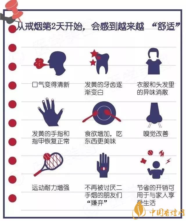 首頁是第一張,其中最大的感概是其中的口氣變得清新、衣服和頭發(fā)里的異味消散、食欲增加吃東西更美味這幾條。戒煙幾天后,不經(jīng)意哈氣,感覺都有類似前女友的淡淡的口香了。其次,衣服被子都沒有煙味。冬天來了,沒有煙味的衣服被子讓自己很舒服。最近也吃得很多,自己挺瘦的,一直想增肥,所以吃多了很開心。因此一想到抽煙,這幾天上面這幾個美好的體驗頓時都要消失的話,想抽煙的想法會大大的打折扣。