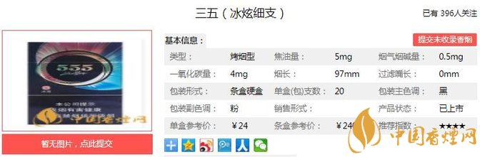 三五冰炫細(xì)支煙支長(zhǎng)97mm,過(guò)濾嘴長(zhǎng)不詳,定位在細(xì)支煙品類。煙支很飽和,煙嘴也是網(wǎng)狀圖案,在上方有個(gè)和外盒爆珠圖案一樣的,標(biāo)注的是爆珠位置,煙嘴與煙支分隔處是一條細(xì)紫色和一條寬銀色圍繞起來(lái),在銀圈上有555字標(biāo)。下面我們一起來(lái)看三五冰炫細(xì)支的參數(shù)信息:焦油量:5mg 煙堿量:0.5mg 一氧化碳量:4mg