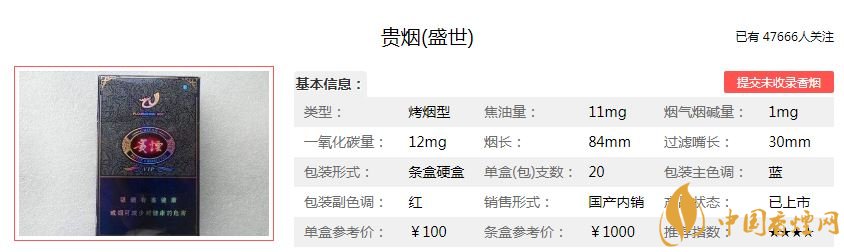 貴煙(盛世)香煙100元/包,這款煙的焦油量:11mg,煙堿量:1.0mg,一氧化碳量:12mg,這款煙采用貴州天柱的珍稀上等煙葉,按照100:1的標準精選加工而成。其煙氣高雅悠長,口味細膩純正,余味圓潤舒適。