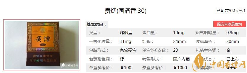 貴煙國酒香30香煙100元/包,這款煙的焦油量:10mg,煙堿量:0.9mg,一氧化碳量:11mg,這款煙抽起來有茅臺酒的酒香味和煙草的香味,順口,綿而不淡,香而不膩