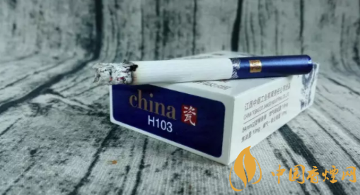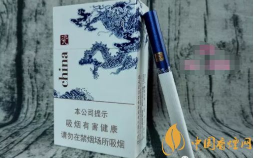 煙盒正面主圖為青花騰龍造型,張牙舞爪,欲入深海而攪起驚濤駭浪。煙盒頂端,印有青花瓷瓶的圖案,同時加以文字簡介。煙盒底端主色調(diào)為深藍(lán),與正反兩面的藍(lán)色青花龍色調(diào)相輔相成。China和瓷的品名,再次印制于此部位。H103,是指產(chǎn)品的隨機(jī)編號。