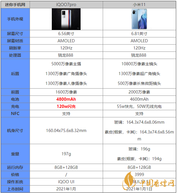iQOO7pro和小米11都是最新搭載驍龍888處理器的手機(jī),許多小伙伴想知道iQOO7pro和小米11哪款更好,哪款手機(jī)更值得入手?下面香煙網(wǎng)小編將為大家介紹iQOO7pro和小米11參數(shù)對(duì)比,對(duì)這兩款手機(jī)感興趣的朋友一起來看看吧!