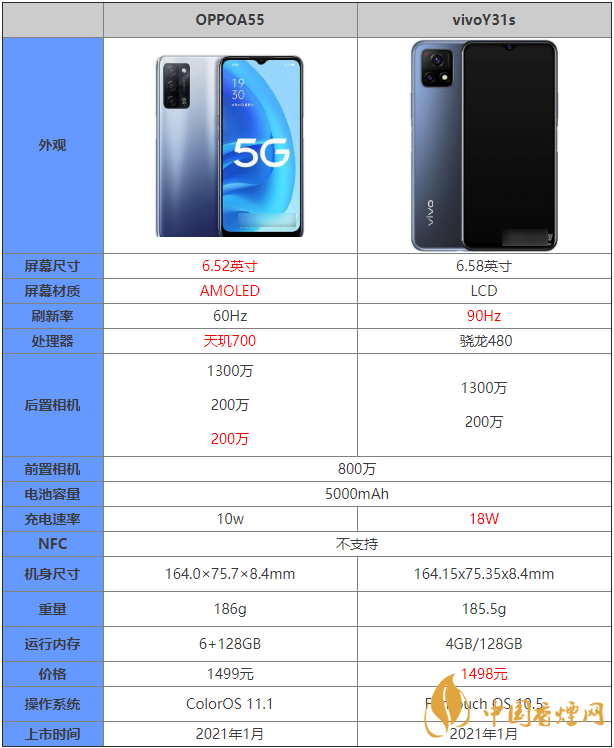 OPPOA55:采用6.52英寸AMOLED屏幕,水滴屏中央挖孔設(shè)計(jì),分辨率2400x1080像素,屏幕刷新率60Hz