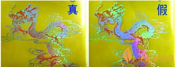 真品小盒正面套印定位燙金“飛龍”圖案鱗片清晰,從頭至尾都能看到定位燙金工藝,紅色貫穿整個(gè)龍身,“鱗片”是雪里透紅,栩栩如生;假煙套印定位燙金仿制較差,鱗片無法達(dá)到真品的印刷工藝水平,與真品存在明顯差異。