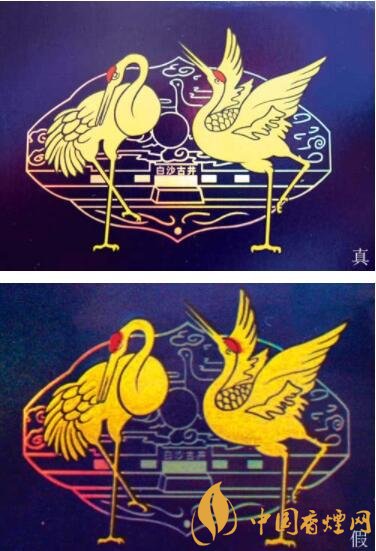 真煙的logo印刷套色分明,圖案上的鶴嘴尖部上長下短,頭頂部紅黃色層套色均勻細(xì)致,眼睛栩栩如生,“白沙古井”字體粗細(xì)一致、飽滿,整體未見顏色圖層重復(fù)、錯位情況;假煙的logo印刷顏色死板,圖案上的鶴嘴部上下長短幾乎一致,鶴頭頂部紅黃色層套色有明顯錯位,眼部線條粗細(xì)不一、且因套色錯層導(dǎo)致眼睛看上去無神,“白沙古井”字體粗細(xì)不一、印刷線條偏細(xì),顏色圖層有重復(fù)、錯位情況。