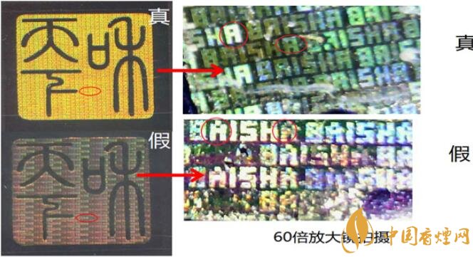 (1)用15倍放大鏡觀察,真煙底部采用全息防偽,“BAISHA”微縮字字體較小,隱隱約約能看清;假煙底部“BAISHA”微縮字字體要清晰一些,但是“A”頂部是尖銳的;
