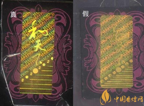 真煙“和天下”立體感強(qiáng),字體筆畫較粗用放大鏡看“HARMONIZATION”微縮字較清晰;假煙的全息防偽無(wú)立體感,用放大鏡看“HARMONIZATION”微縮字較模糊,且“和天下”字體筆畫較細(xì),與真品特征存在明顯差異。