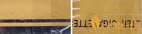 1.商標(biāo)字體印刷。真品卷煙商標(biāo)印刷采用“凹印”,兩種顏色交界邊緣呈現(xiàn)虛邊或鋸齒狀。假冒卷煙商標(biāo)印刷一般采用“膠印”,兩種顏色交界邊緣比較清晰、光滑,無鋸齒狀。(圖1左真右假)