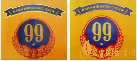 真品卷煙:1.商標(biāo)LOGO稻穗圖案凸起,整體立體、飽滿,大豐收。2.99數(shù)字筆畫圓潤(rùn)、飽滿,下面圓點(diǎn)尤為突出。3. 藍(lán)色底紋顏色重,邊緣向中間色彩過渡自然。4.商標(biāo)紙流水紋路清晰可見。