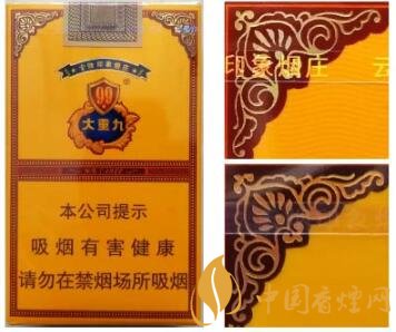 真品卷煙:1.“盾牌”圖案呈現(xiàn)凸起,手摸凹凸明顯,數(shù)字“9”筆畫中間凸邊緣凹。2.花團(tuán)圖案整體高于商標(biāo)紙面,細(xì)節(jié)處凹凸感強(qiáng)。3.“大重九”字體筆畫呈現(xiàn)中間凸邊緣凹,立體感強(qiáng)。4.藍(lán)色底紋顏色重,邊緣向中間色彩過渡自然。