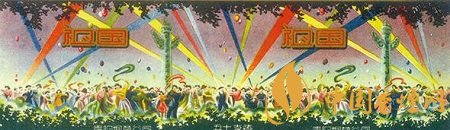 而貴陽煙草公司出品于上世紀(jì)50年代的“祖國”煙標(biāo)(圖4),主版采用明快色調(diào),描繪出了新中國成立后人民當(dāng)家作主的喜悅之情:只見各族人民身著節(jié)日盛裝,在彩球飄飄、五顏六色的射燈光柱直射天空背景襯托下,聚集于天安門前的華表周圍,在撼天動(dòng)地的鼓樂聲中載歌載舞,盡情地歡慶新中國的誕生。