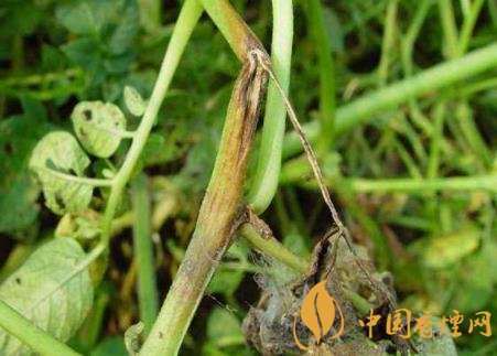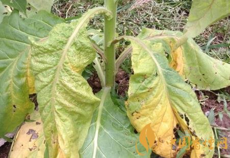 癥狀:煙草青枯病是維管束病害,典型癥狀為枯萎,病株多為一側(cè)枯萎,拔出后可見發(fā)病的一側(cè)支根變黑腐爛,未顯癥的一例根系大部分正常。葉片發(fā)?。撼跗谲浕?,但仍為青色,故稱“青枯病”,隨著細菌充滿葉脈,兩天后葉脈變黑,葉內(nèi)為黃色網(wǎng)狀病斑。莖發(fā)?。撼霈F(xiàn)長形黑色條斑,有的條斑擴展到病株頂部或枯萎的葉柄上。到發(fā)病中后期,全部葉片萎蔫,條斑表皮變黑腐爛,病株莖和葉脈導(dǎo)管變黑,根部也變黑腐爛,甚至莖髓部呈蜂窩狀或全部腐爛形成空腔,僅留木質(zhì)部。橫剖病莖用力擠壓切口,從導(dǎo)管溢出黃白色菌膿。