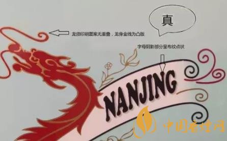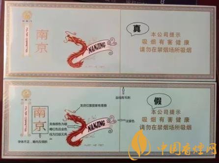 看條盒顏色,真煙為淡藍(lán)色,顏色柔和純正;假煙為淺藍(lán)色,視覺上顏色不是自然色??礂l盒圖標(biāo),真煙“南京”二字字體端正清晰,龍須印刷圖案無重疊,龍身金線為凸版,條盒金邊無毛刺;假煙“南京”二字字體向左微傾,龍須有疊痕錯(cuò)層,龍身顏色為褐紅色、金線為凹版,條盒金邊有毛刺。