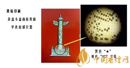 5、用放大鏡查看條盒小盒商標(biāo)背面華表底部位置,可以看到黑色“★”、黃色“YC”字母。