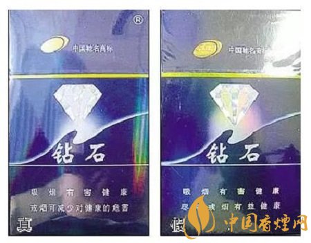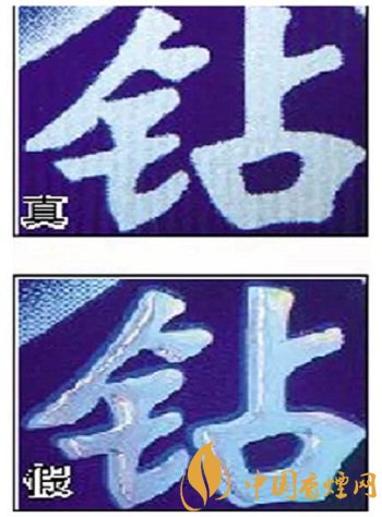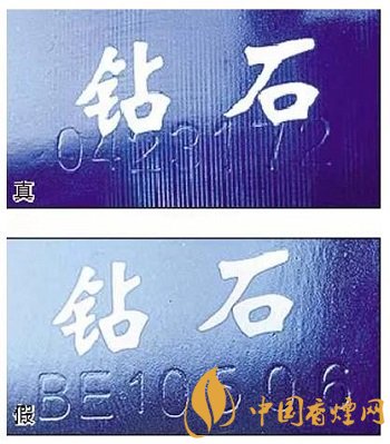 真煙鉆石圖案印刷清晰,色彩感強,內(nèi)有微縮英文字母“DIAMOND”,圖案無凹凸感;假煙印刷不清晰,用手摸上去有凹凸感。