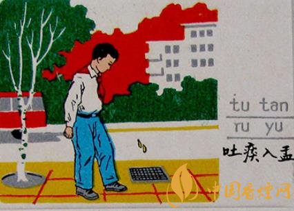 火花圖案采用宣傳畫的形式,人物形象生動(dòng)逼真,色彩鮮艷明快,具有濃郁的生活氣息。如一枚主題為“吐痰入盂”的火花(圖2)上,一位穿白襯衫系紅領(lǐng)巾的小男孩正彎著腰,對準(zhǔn)人行道的一口窨井吐入一口痰。背標(biāo)除一枚“精神文明”紅色橢圓篆印外,另有“小小一口痰,細(xì)菌千千萬”的宣傳文字;還有一枚主題為“講衛(wèi)生”的火花上,一個(gè)揮舞著小紅旗的大爺,在綠樹成陰、高樓林立的繁華鬧市,正對一年輕家庭亂扔垃圾的行為進(jìn)行勸說教育,旁邊佩戴紅袖章的大媽打掃著他們隨手丟棄的雜物,小女孩則在一旁低頭認(rèn)錯(cuò)。副標(biāo)上“違章必罰”的紅色篆印十分醒目。通過小小的火柴,科學(xué)宣傳防疫知識,提高公眾自我保護(hù)意識,早宣傳,早預(yù)防,起到了事半功倍的作用。