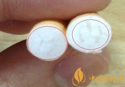 細(xì)看煙嘴角顏色,左邊黃色較右邊顯得較深,光憑這點(diǎn)可能會受光線的影響,用力揉搓煙嘴,就會發(fā)現(xiàn)右邊假煙部分濾嘴基本已經(jīng)散架,中間已經(jīng)變成了空心。而且黃色的紙也有所破損。而左邊的真煙嘴完好無損。只有些許揉捏痕跡。