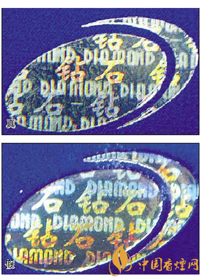 五看鉆石圖案:真煙鉆石圖案印刷清晰,色彩感強(qiáng),內(nèi)有微縮英文字母“DIAMOND”,圖案無凹凸感;假煙印刷不清晰,用手摸上去有凹凸感。