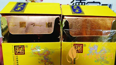小盒商標(biāo)印刷工藝差異對比:真品小盒正面套印定位燙金“飛龍”圖案鱗片清晰,從頭至尾都能看到定位燙金工藝,紅色貫穿整個(gè)龍身,“鱗片”是雪里透紅,栩栩如生;假煙套印定位燙金仿制較差,鱗片無法達(dá)到真品的印刷工藝水平,印刷工藝與真品商標(biāo)圖案差異明顯。
