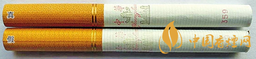 煙支印刷差異對比:真煙煙支過濾嘴上的兩個(gè)金色圓圈較寬;假煙煙支過濾嘴上的兩個(gè)金色圓圈較窄。