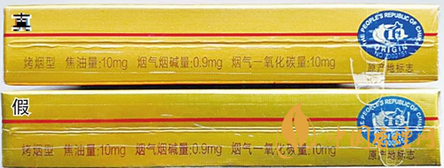 正面商標(biāo)紙印刷工藝差異對比:真煙商標(biāo)紙采用壓凸?fàn)C金工藝,中間天安門圖案用手摸凹凸感明顯,且天安門城墻上有細(xì)密的橫線條;假煙采用高清掃描仿制印刷,中間天安門圖案用手摸凹凸感不明顯,且天安門城墻上沒有橫線條。