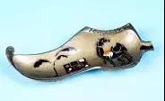 這款造型奇特的工藝煙灰缸來(lái)自以色列,為金屬質(zhì)地,外層漆金。整體造型為以色列特有的翹頭鞋,鞋跟處伸出一截短短的煙槽,鞋口則有陰刻的“JERUSALEM”(耶路撒冷)字樣;鞋身用簡(jiǎn)單的黑、紅、黃、白勾勒了具有明顯地域色彩的花紋,如回首的駱駝、椰樹(shù)、城墻等。整件作品的造型和色彩都帶有濃郁的中東風(fēng)情,高檔煙灰缸圖片十分別致。